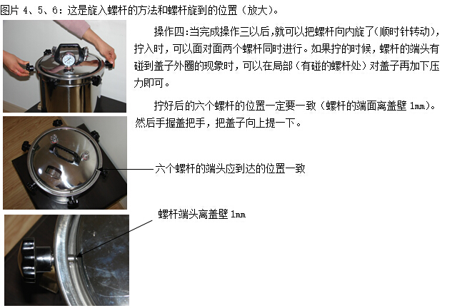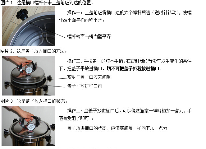 c  適當退出已經擰在滅菌器桶口邊上的膠木螺釘,使螺釘端頭離開器蓋的邊緣,然后小心提起器蓋。切勿使用提拉放汽管的方法提起器蓋。