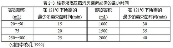 滅菌器內冷空氣,以便使蒸汽能到達各個消毒部位,保證消毒滅菌徹底。然后繼續加壓加熱,當壓力表讀數達到1.0~1.1 kg/cm2為121 ºC,保持15~20 min即可。由于消毒滅菌效果取決于溫度而不是壓力,所以在一定壓力下保持較長的消毒滅菌時間是必須的。在121 ºC的蒸汽溫度下可以很快殺死各種細菌及高度耐熱的芽孢桿菌,因此許多培養液的消毒滅菌壓力、溫度一般保持在1.0~1.1 kg/cm2、121 ºC。消毒滅菌時間與需要消毒滅菌的培養液量密切相關(表2-3),時間不足達不到滅菌效果,時間過長培養液內的一些化學物質遭到破壞,影響培養液成分。消毒滅菌結束后,關閉熱源,只有當