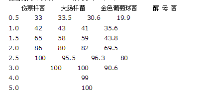 (三)紫外線滅菌法:波長200~300nm,易穿透潔凈的水和空氣,用于空氣和物體表面滅菌。紫外線燈有效使用期一般為3000小時。 紫外線照射時間對微生物殺滅率見表:  照射時間(小時)      殺 滅 率 (%)