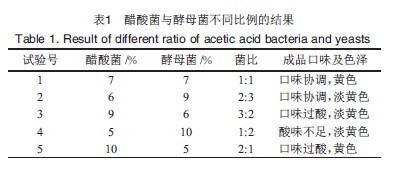 在發酵液中,酵母菌利用發酵液中的糖分,發酵成酒精,同時醋酸菌把生成的酒精轉化成醋酸,酸化發酵液,不同的菌比所產生的效果(表1)可知,選擇醋酸菌和酵母菌