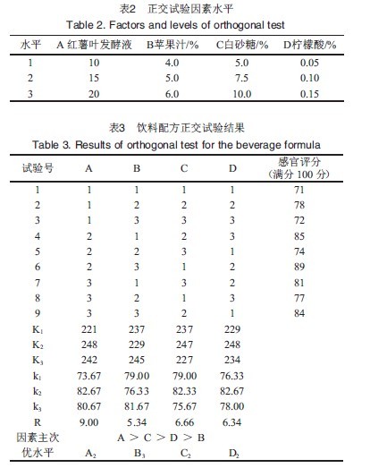 **優水平為A2B3C2D2,即紅薯葉發酵飲料的**優配方為紅薯葉發酵液15%,蘋果汁6.0%,白砂糖7.5%,檸檬酸0.10%,為了保持飲料的穩定性,添加β-環糊精,添加量為0.8%。按正交試驗得出的配方進行飲料配制,得到的飲料經感官評分為90分,說明此配方**佳。