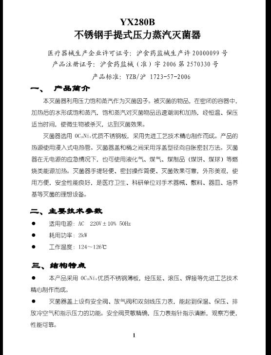 上海三申YX-280B手提式不銹鋼蒸汽滅菌器說明書